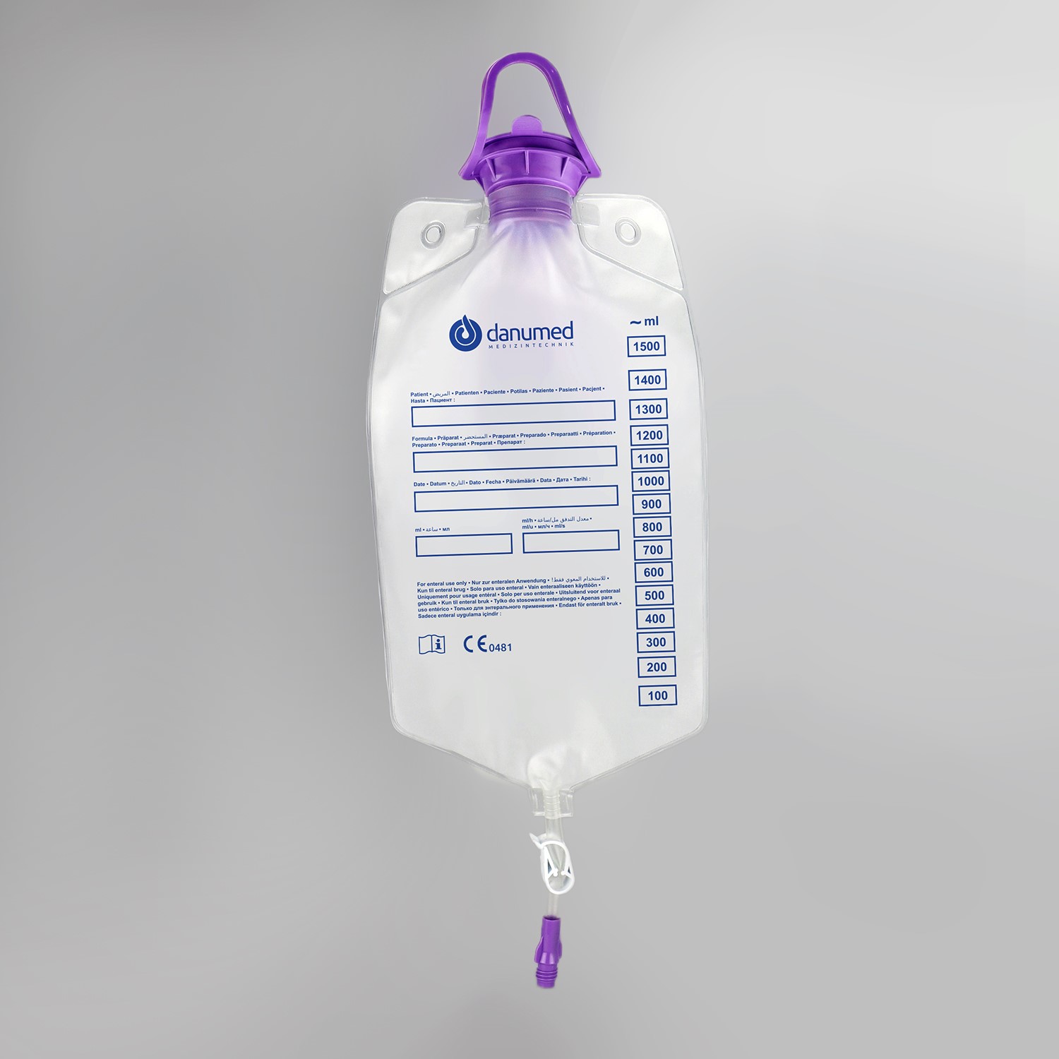 Pusty worek do żywienia dojelitowego i bilansowania płynów o pojemności 1500 ml, skalowany co 100 ml.